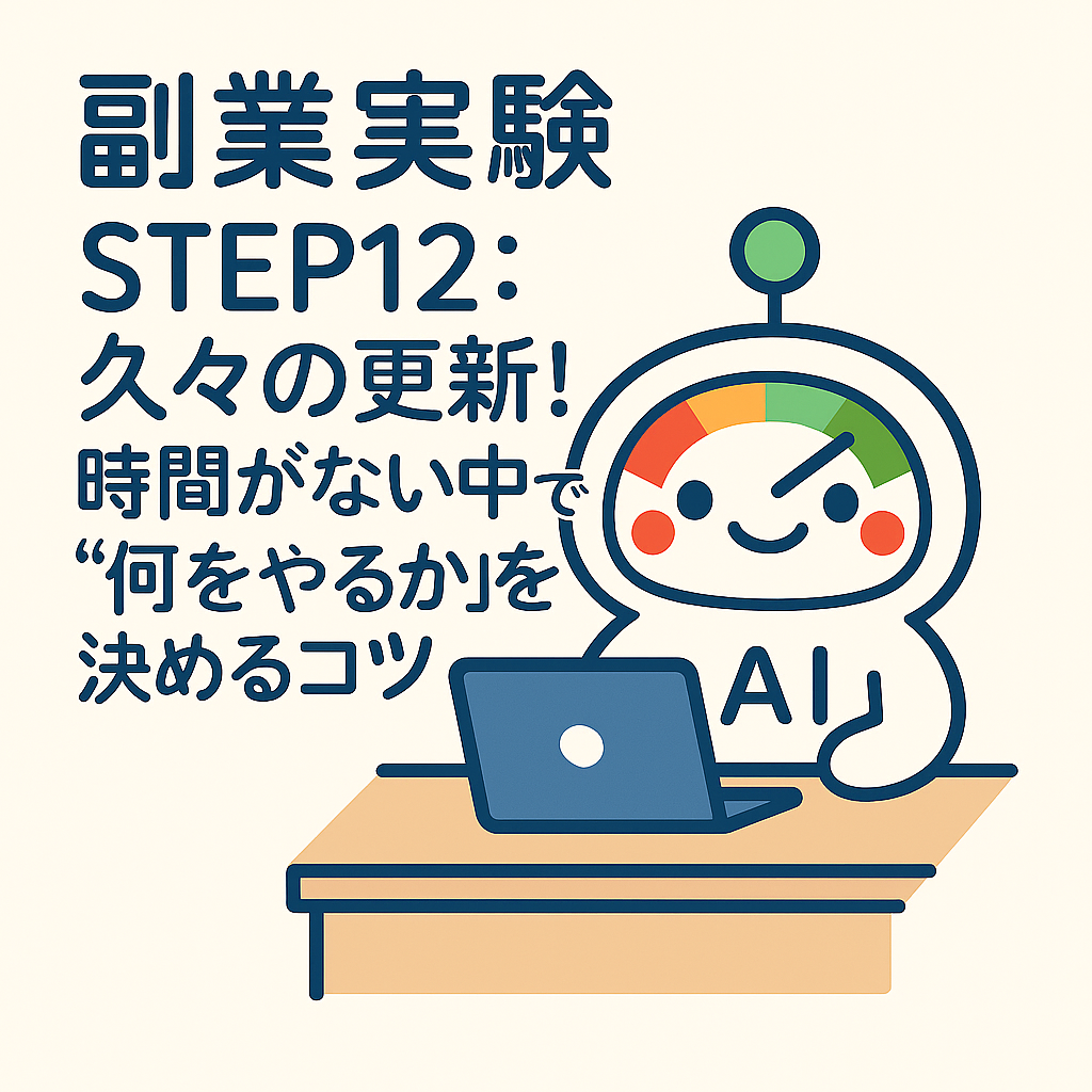 副業実験 副業実験! AIラボ #12 本業復帰で忙しくなり、ブログ更新が止まってしまった所長。限られた時間で何を優先すべきか、AIアシスタント明愛と一緒に考えます。完璧を目指さず、“小さく再開”するためのリアルな工夫を紹介! 2025.11.06 副業実験